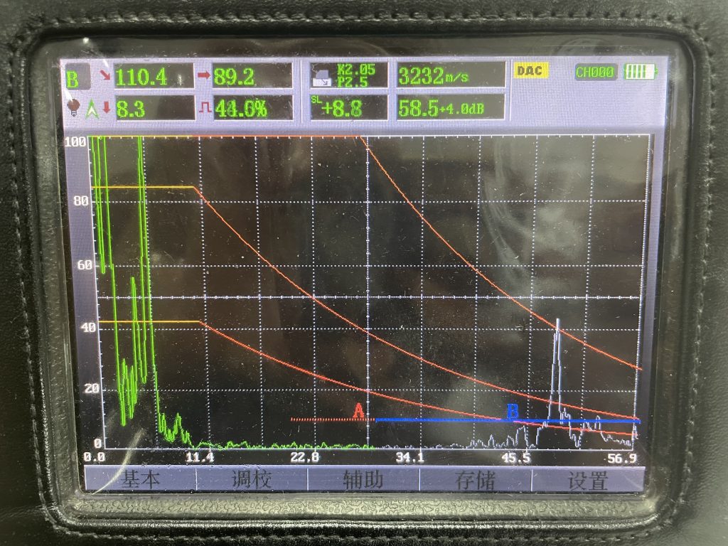 探頭置于B處:顯示深度略大于2倍板厚(如儀器設(shè)置了根據(jù)工件厚度自動計算缺陷深度功能,則顯示深度接近余高高度,但已超出2次波范圍)。