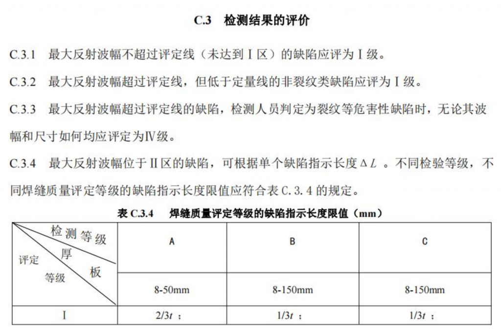 | 評級 | Ⅰ區(qū)缺陷為Ⅰ級, Ⅱ區(qū)缺陷根據(jù)指示長度評級, III區(qū)缺陷為Ⅳ級 | 根據(jù)顯示長度與板厚的倍數(shù)關(guān)系確定驗收等級 | |