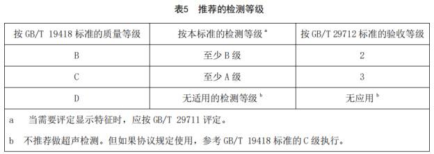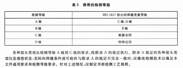 | 6 | 4 總則 本標準的目的是,對于溫度范圍為 0~60℃的普通焊接接頭,使用標準條款進行超聲檢測的通用技術。 本標準規定了檢測設備、檢測準備、檢測實施和報告等具體要求。具體參數(尤其探頭)符合 GB/T 29712 和 GB/T 29711 要求 | 5?通則 本文件目的是確立溫度0℃~60℃的常見焊接接頭超聲檢測的通用技術。本文件覆蓋了檢測設備、檢測準備、檢測實施和報告等內容。具體參數規定尤其是探頭的參數,與ISO11666和ISO23279的規定保持一致。如果焊接接頭兩側母材厚度不相同,則應考慮兩側母材厚度的較小值。應規定使用的技術。 | 更改了總則(見第5章,2013年版的第4章) |